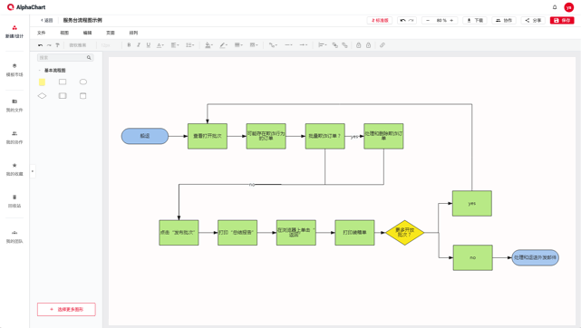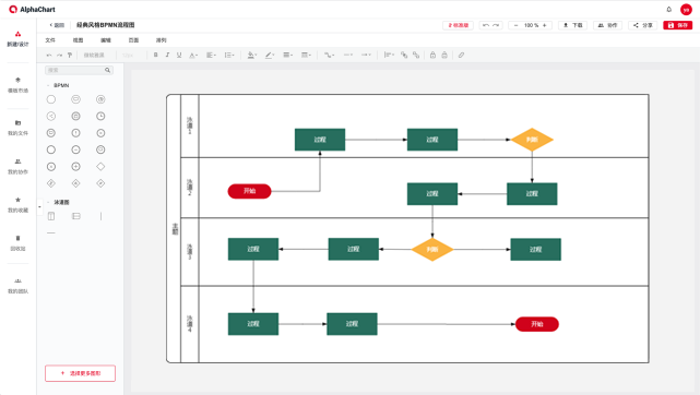 在AlphaChart中每個符號都是矢量的,可以填充顏色,改變大小,定義數(shù)據(jù)和連接。在流程圖標(biāo)準(zhǔn)符號包括4個基本流程符號橢圓形、矩形、箭頭、菱形和5類中高級的流程圖符號。通用流程圖